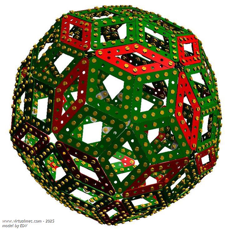 I saw this model built among Esteban Orosco Vallejo asseblies. It has 90 losangular faces of 5h strip edges, where 60 are of one shape and 30 of other. I had to use some artifices in order to draw it with VirtualMec due to the need of joining not aligned adjacent holes of edges where different losangs met.
