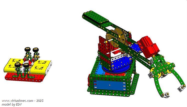 Following the Märklin's instructions I assembled this model, modified to conciliate equivalent Meccano parts. Approximatelly, I paired the Märklin color scheme of the original plan. As I did not build it phisically there may be unidentified flaws on my assembly that will have to be debugged in action.