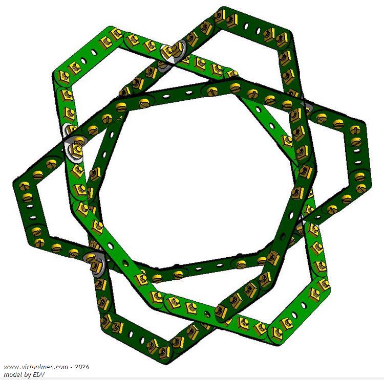 Having concluded that the drawing of curve part #90 in VirtualMec is incorrect (It builds a perfect circle with 32 holes while the Meccano part does it with 30 holes; therefore in VM it is an arc of 45º while the real one has an arc of 48º) I decided to build this model with octogonal rings instead of circles. The plane of each ring is at 90º to the plane of the other 2
