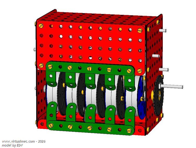 Replicating Tim Robinson's model,like in a car odometer, this mechanism exhibits the number of turns counted up to 10,000 turns where the first drum on the right divides one turn in tenths of a turn.