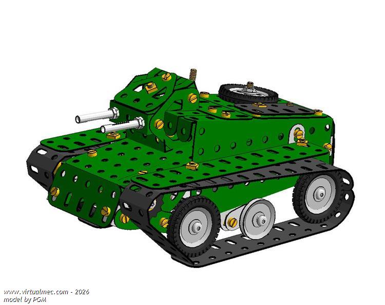 This model should use caterpillar tracks, not available in Virtualmec, so I have realized them from black bent flat girders 5 1/2" (part n°103)
