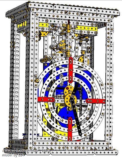 This remarkable clock is made with 99% standard Meccano parts. It is considered extremelly precise and reliable. In order to build, understand and adjust it, it is mandatory to read MP104. This is available from Howard Somerville MW publications. I drew this model following its instructions, intending to help those interested to build it, using simultaneously for this purpose, the Isomec Diagrams and booklet text of MP104. I used artifices to hold the weight and counterweight in the air since VM does not provide the necessary chain image file. The flexible pendulum suspension strip used on the drawing is the one available from VM, different in lenght and width, from the one recomended by the MP104 instructions.The dial face was also a variation from the one suggested by MP104, since, as a nom Meccano part, it did not exist on VM