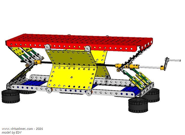 Based upon the Sarru's linkage concept the upper platform is raised paralel to its base by turning the crank of the threaded rod.