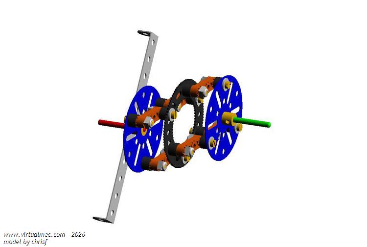 Input shaft red, output green. Output shaft free to move through 3" radius. Demo model only. Not sure of virtue of 6 joint version. Design may be registered by German engineering firm which I have not been able to identify. Commercial rights belong to them. I used the gear BECAUSE there is no 12 hole 2 1/2" plate. It is NOT a proper component of the coupling