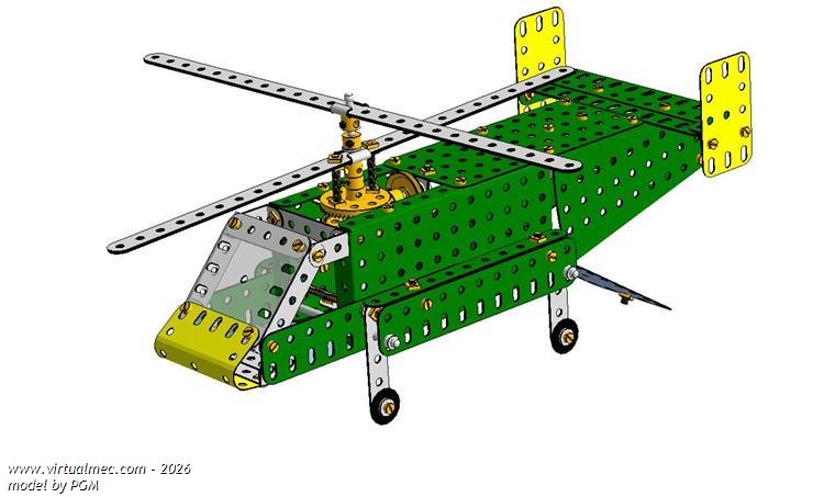 the helicopter is powered by a meccano 6 v motor : the battery pack and the swihtch are inside the body and are accessible from the rear door
