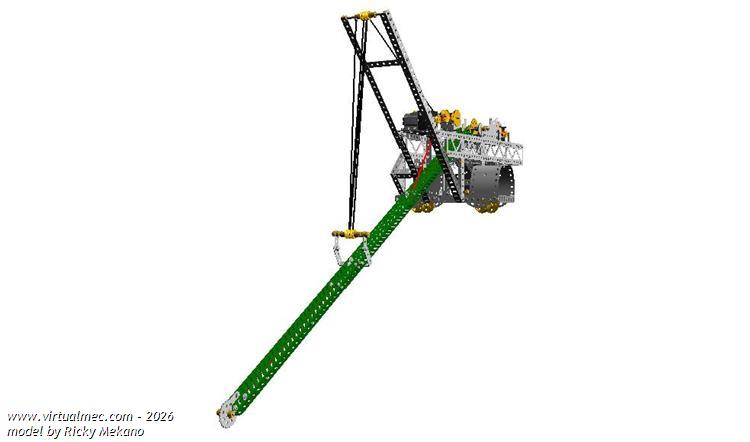 Improved mechanism on strong structure. The originality is the balanced structure like a crane one. No another bogie to stand the whole model. And it works very well! The only disadvantage is the tight angle bucket arm movement.